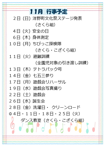 | 霜月 朝夕冷え込み、寒さが身に染みる季節となりました。体調管理に気を付けて参りましょう。数日前から年長さんと百人一首を一句ずつ覚えています。「田子の浦にうち出でてみれば白妙の 富士の高嶺に雪は降りつつ」山部赤人 この一首から風景が想像出来自分もその場所にいるような感動を覚えます。なんと素敵な一句でしょう。子ども達は日頃から言葉で伝える事が難しくなってきています。そしてトラブルになっています。沢山感動する絵本、出来事を経験して欲しいと思います。 |