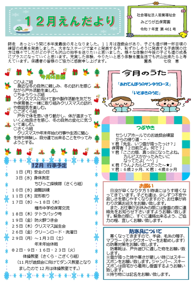 | 師走 あっという間に本年度最後の月となりました。11月は遊戯会があり、子ども達が精一杯日頃の練習の成果を発表しました。大きなステージで堂々と発表する子、恥ずかしそうに発表する子表現の仕方は様々でしたがどの子にも沢山の拍手を送りたいと思いました。様々な体験が今後の子ども達の成長にプラスになっていくと思います。充実した体験、やりたいと思う体験を園生活でも沢山出来たらと考えています。保護者の皆様のご協力に感謝申し上げます。 |