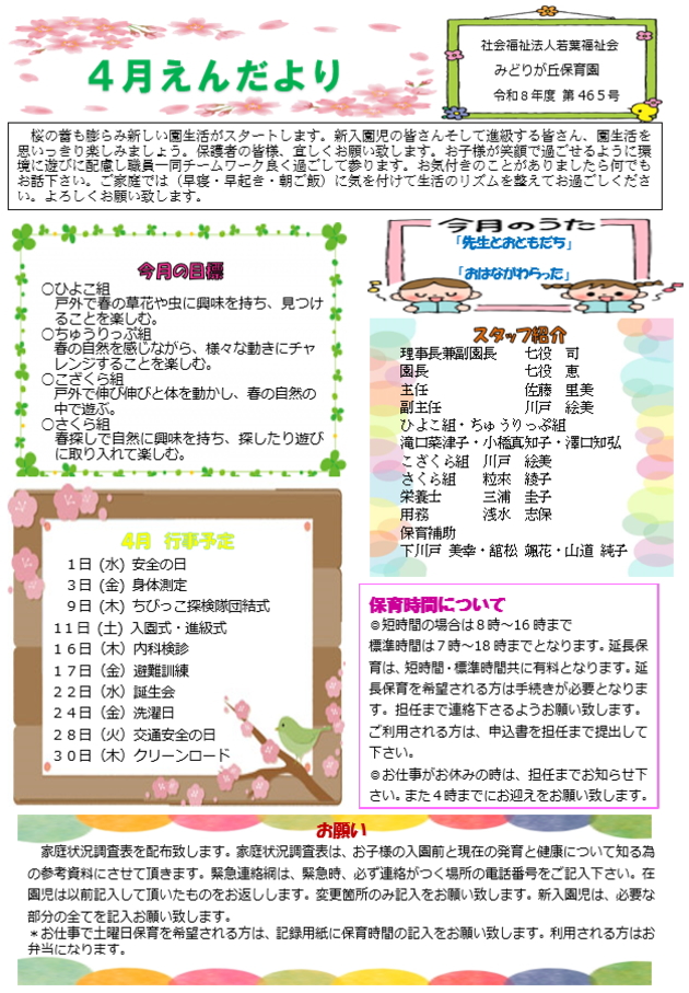 | 桜の蕾も膨らみ新しい園生活がスタートします。新入園児の皆さんそして進級する皆さん、園生活を思いっきり楽しみましょう。保護者の皆様、宜しくお願い致します。お子様が笑顔で過ごせるように環境に遊びに配慮し職員一同チームワーク良く過ごして参ります。お気付きのことがありましたら何でもお話下さい。ご家庭では(早寝・早起き・朝ご飯)に気を付けて生活のリズムを整えてお過ごしください。よろしくお願い致します。 |