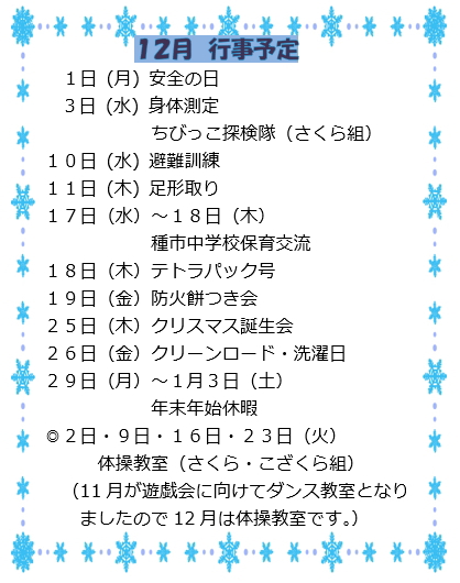 | 師走 あっという間に本年度最後の月となりました。11月は遊戯会があり、子ども達が精一杯日頃の練習の成果を発表しました。大きなステージで堂々と発表する子、恥ずかしそうに発表する子表現の仕方は様々でしたがどの子にも沢山の拍手を送りたいと思いました。様々な体験が今後の子ども達の成長にプラスになっていくと思います。充実した体験、やりたいと思う体験を園生活でも沢山出来たらと考えています。保護者の皆様のご協力に感謝申し上げます。 |