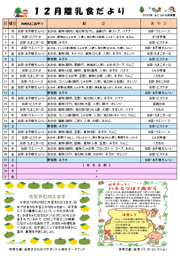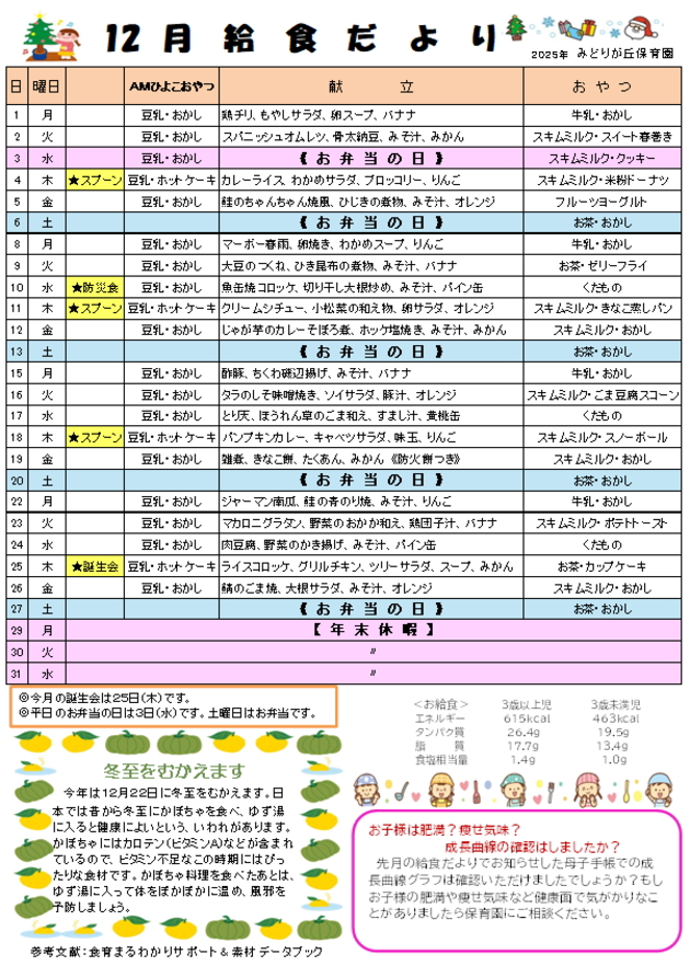 クリスマスや年末年始の行事や生活に関心を持ち体験し、自分達で出来ることをやってみようとする。 |