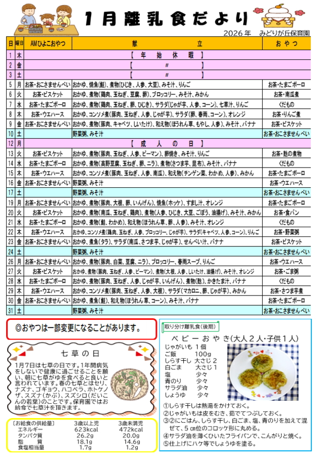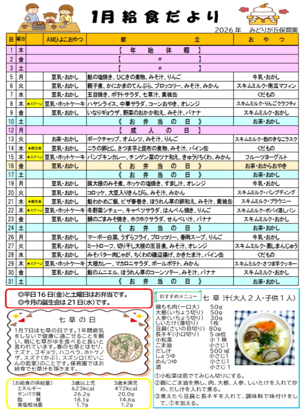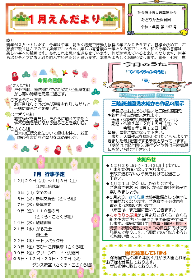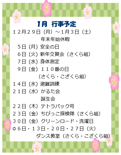◆1月より、さくら組は就学準備として徐々に午睡がなくなります。ご家庭で十分休息を取るようお願い致します。(布団は、まだ園に置いておきます。)