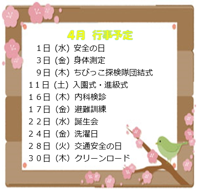 | 桜の蕾も膨らみ新しい園生活がスタートします。新入園児の皆さんそして進級する皆さん、園生活を思いっきり楽しみましょう。保護者の皆様、宜しくお願い致します。お子様が笑顔で過ごせるように環境に遊びに配慮し職員一同チームワーク良く過ごして参ります。お気付きのことがありましたら何でもお話下さい。ご家庭では(早寝・早起き・朝ご飯)に気を付けて生活のリズムを整えてお過ごしください。よろしくお願い致します。 |