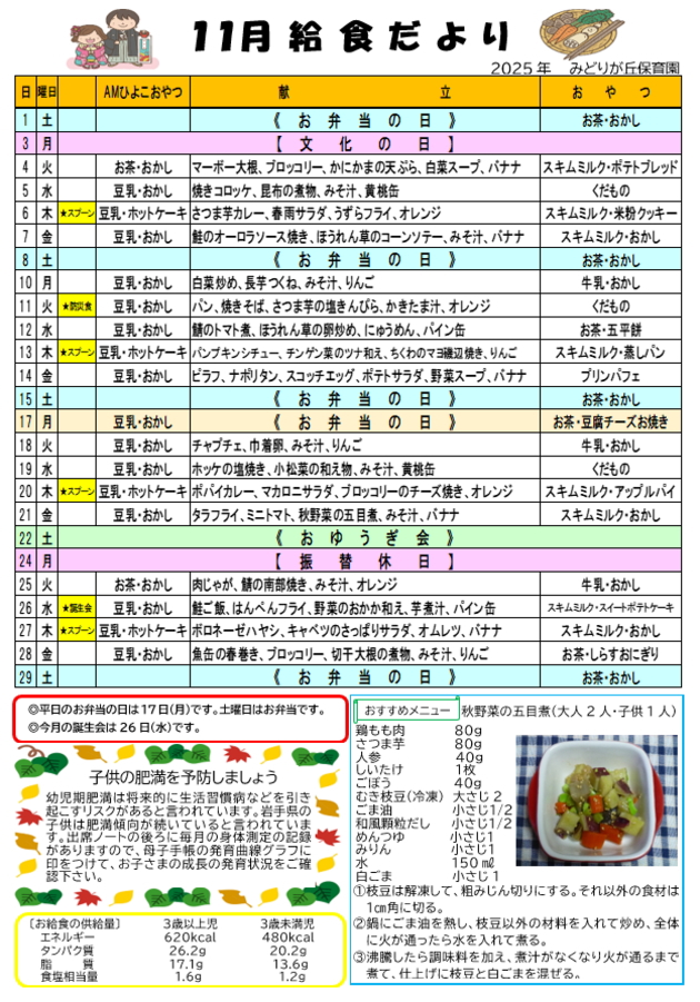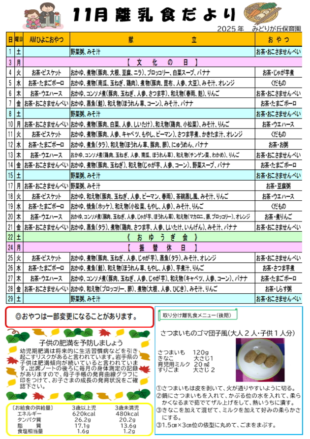 霜月 朝夕冷え込み、寒さが身に染みる季節となりました。体調管理に気を付けて参りましょう。数日前から年長さんと百人一首を一句ずつ覚えています。「田子の浦にうち出でてみれば白妙の 富士の高嶺に雪は降りつつ」山部赤人 この一首から風景が想像出来自分もその場所にいるような感動を覚えます。なんと素敵な一句でしょう。子ども達は日頃から言葉で伝える事が難しくなってきています。そしてトラブルになっています。沢山感動する絵本、出来事を経験して欲しいと思います。